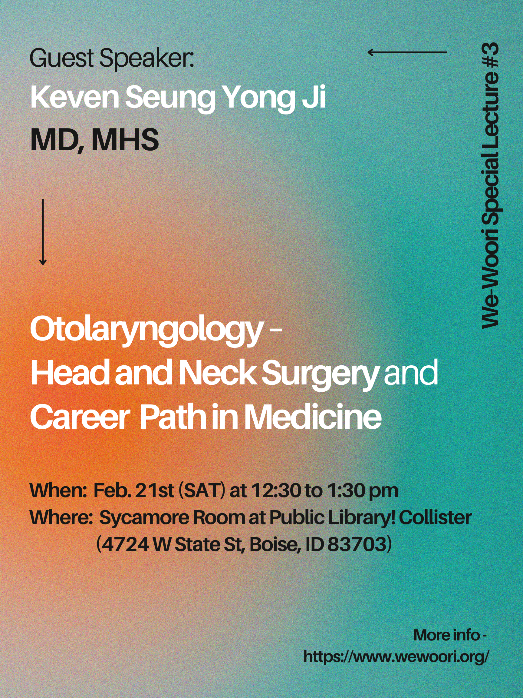 We-Woori's first special lecture of 2026 (SL#3) will be given by Dr. Keven Seung Yong Ji (MD, MHS), an ENT specialist practicing at Meridian. The schedule and location are as follows: